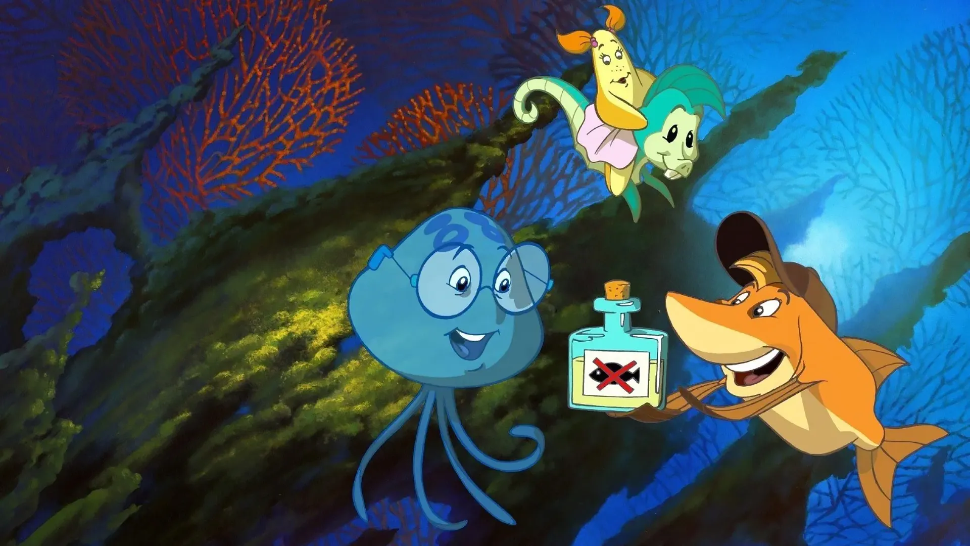 Profitant de l'absence de leurs parents et de la baisse de vigilance de la Tante Anna chargée de les surveiller, Fly, sa petite soeur Stella et leur cousin Charles filent vers l'océan pour aller à la pêche. Mais la partie tourne court. Les trois enfants découvrent par hasard un laboratoire secret où vit le professeur Crevette. Ce savant se révèle aussi génial que farfelu. Il est l'auteur d'une potion qui transforme les humains en poissons.